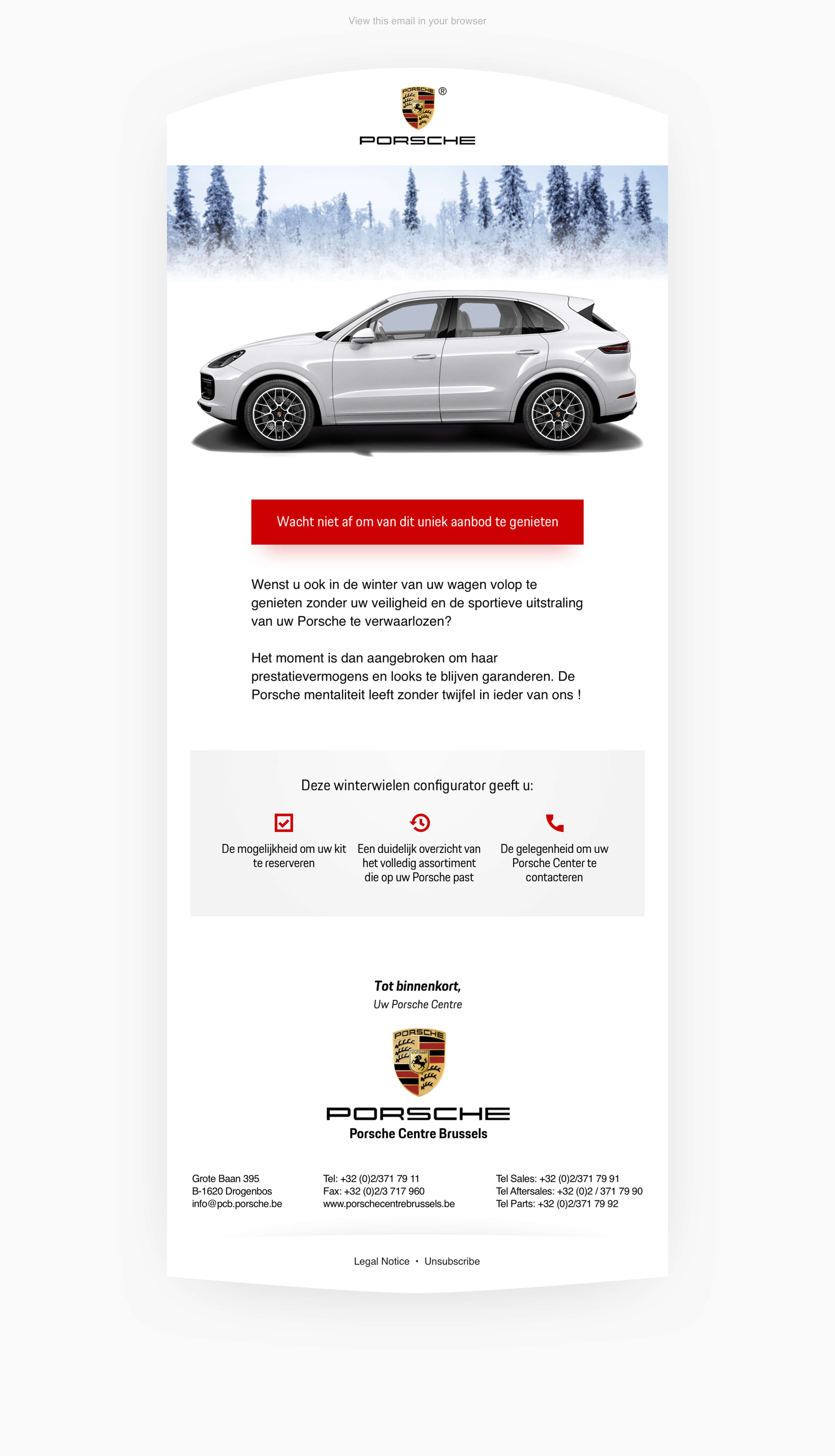 Porsche – the car brand we don't have to present anymore – approached us to help them to boost equipment sales. We got one clear objective: introducing the Porsche winter kits to brand owners and convince the prospects to choose an original Porsche product. By simulating various winter kits on each client's vehicle, we encouraged them to book an appointment and have them placed.