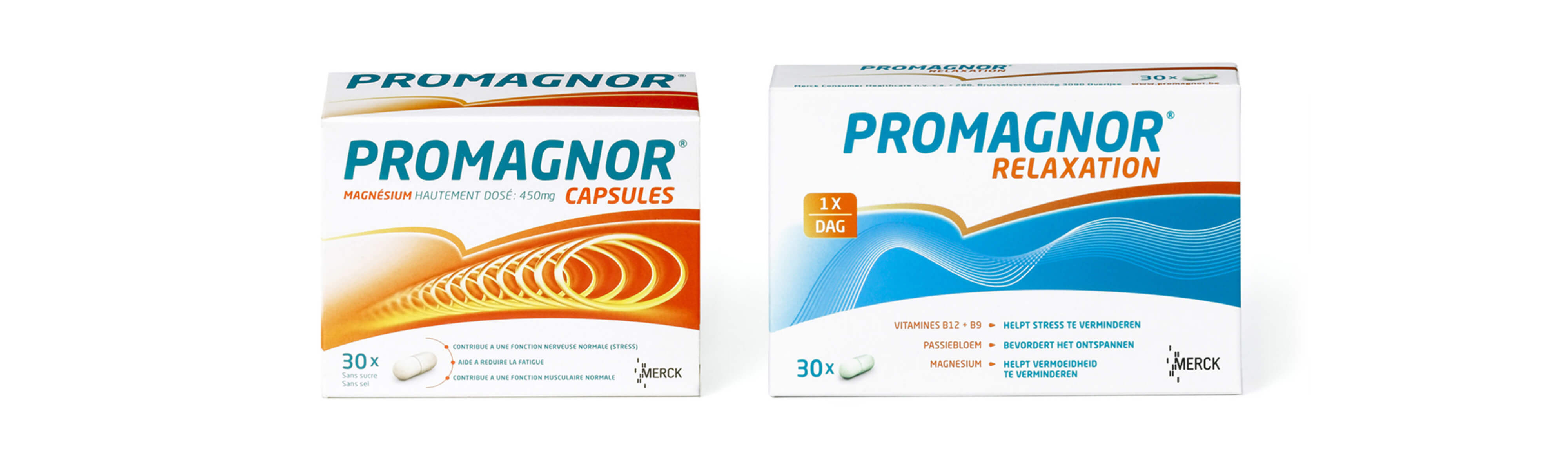 Its new dynamic design gives a stronger shelf impact. It makes the pack jump off the shelf and land directly into your shopping bag. The name Promagnor in italic and the specific orange pantone color both enhance this impact. We aligned with the same structure for the « Relaxation » variant, but adapted it to achieve a more central design, focused on calming blue colours.